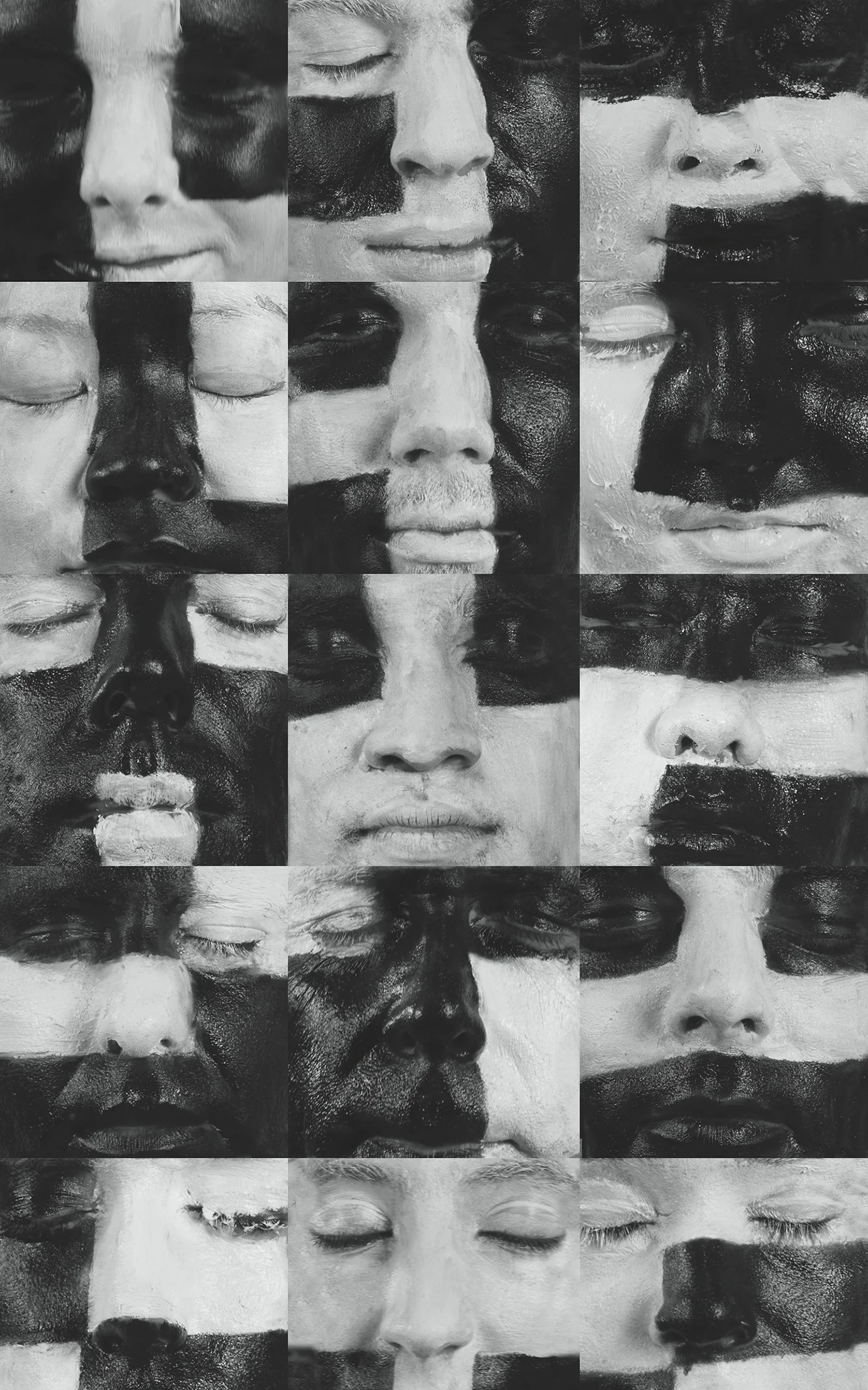 The first part involved a public workshop designed as an immersive and participatory experience for 60 individuals. At the center of the workshop was the production of a series of portraits. For the portraits, the participant’s faces were painted with black and white patterns that corresponded to pieces of a collective QR code. Each individual’s face became one segment of the whole code pattern.